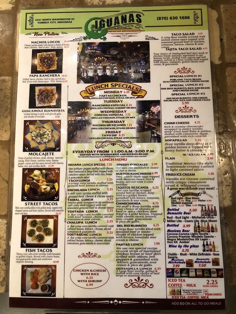 Welcome to Iguanas Mexican Restaurant, a hidden gem nestled in Forrest City, Arkansas. Their extensive menu boasts a vibrant array of authentic Mexican dishes, ensuring there's something for everyone, including plenty of vegan and vegetarian options. Whether you're craving tacos de lengua or a hearty burrito grande, each plate is crafted to delight your taste buds.